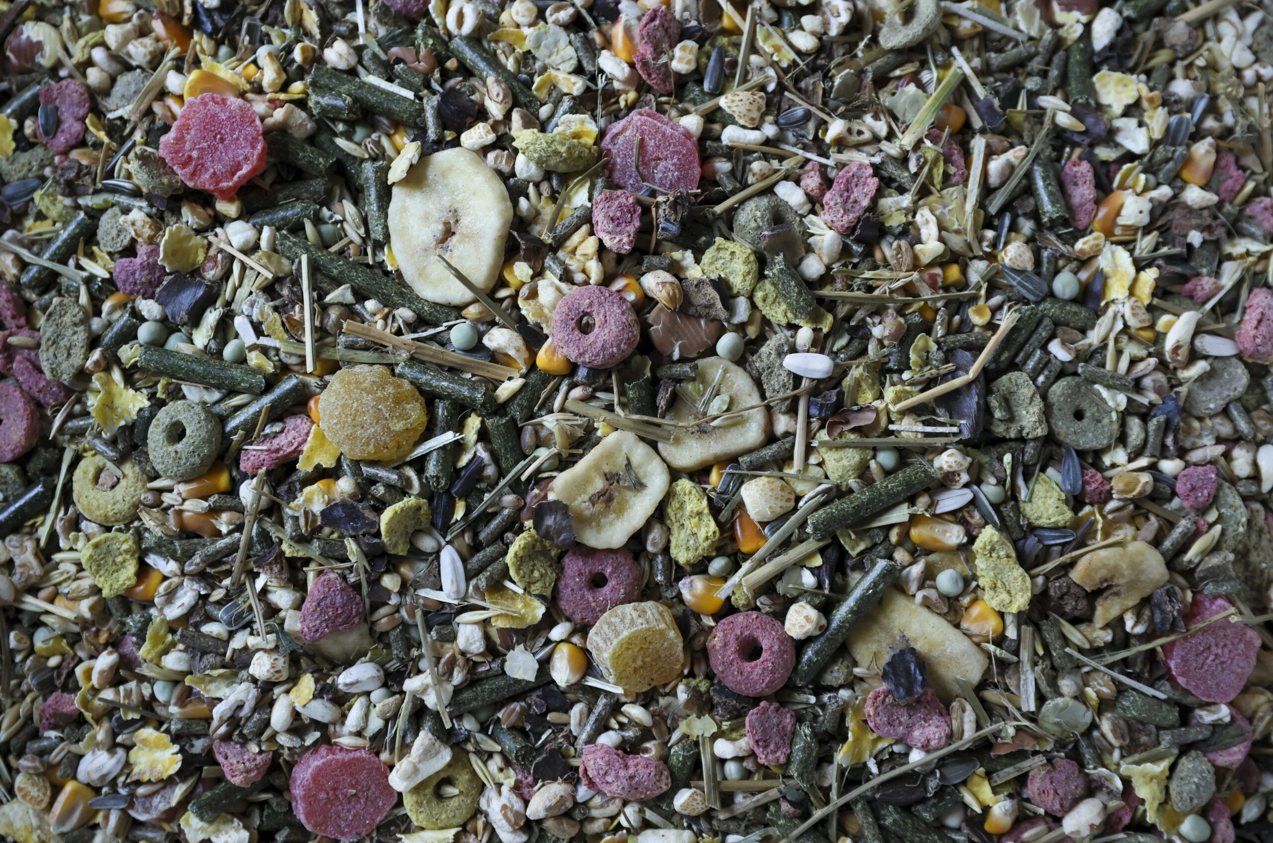| Composition | Ingredients: Medic (Alfa-Alfa), Colorful Croquets from cereals & vegetables (beetroot), Carob, Corn, Oats, Corn Flakes, Striped Sunflower big, Wheat, Puffed Rice, Barley, Green Peas, Dried Fruits, Pea Flakes, Barley Flakes, Banana Chips, White Sunflower, Hay. |